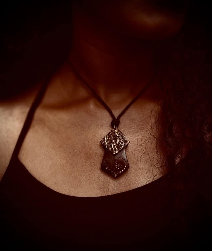 This elegant necklace is hand-carved from natural coconut shell and shaped into a bold geometric design. The textured surface and deep natural color give it a strong yet refined look.