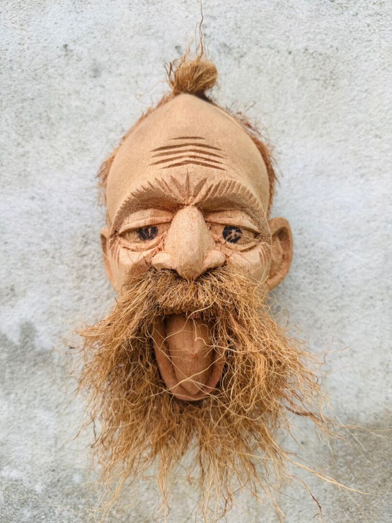 Carved from natural coconut shell and finished with real coconut fiber beard, this mask carries the strong presence of an island elder. His deep eyes and expressive face tell a story of wisdom, strength, and tradition.