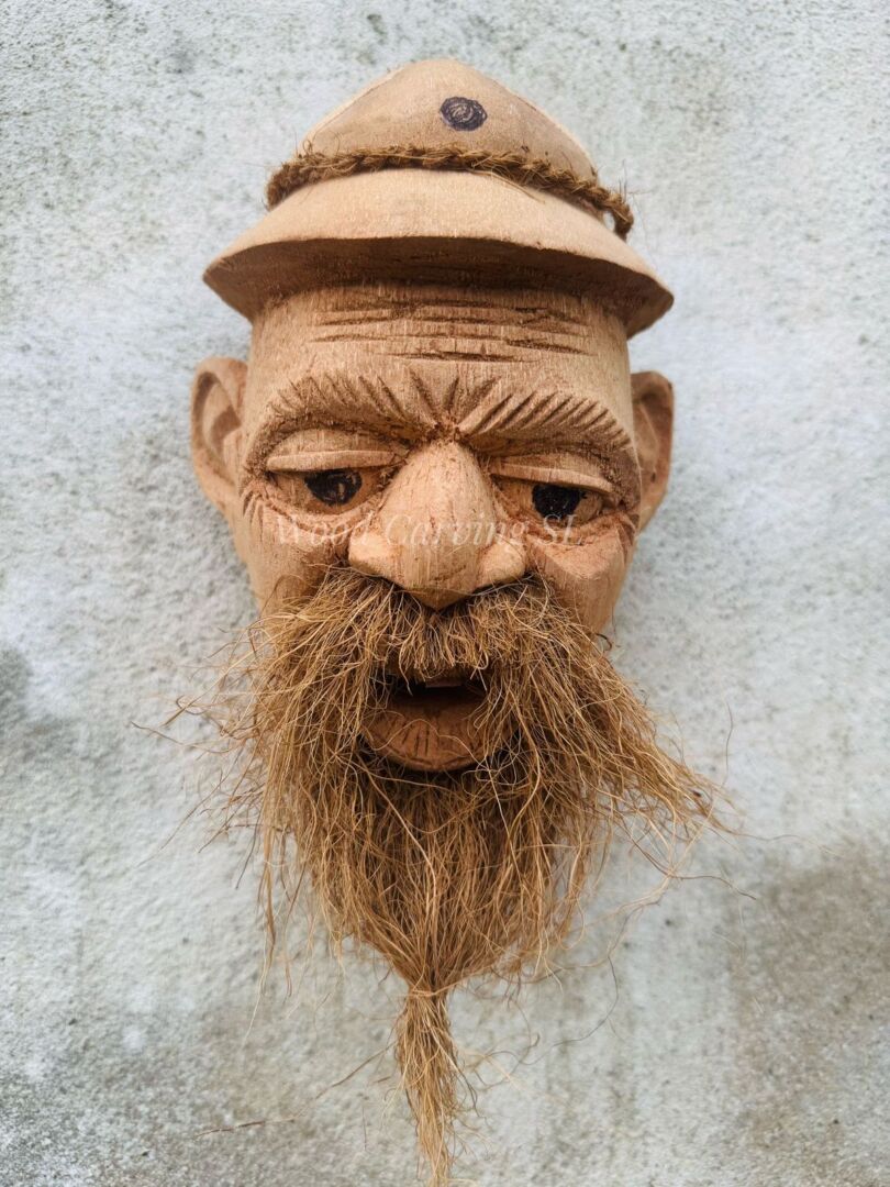 This handcrafted mask is made from natural coconut shell and coconut fiber, shaped into the face of a humble village elder. The detailed carving, expressive eyes, and natural fiber beard give it strong personality and authenticity.