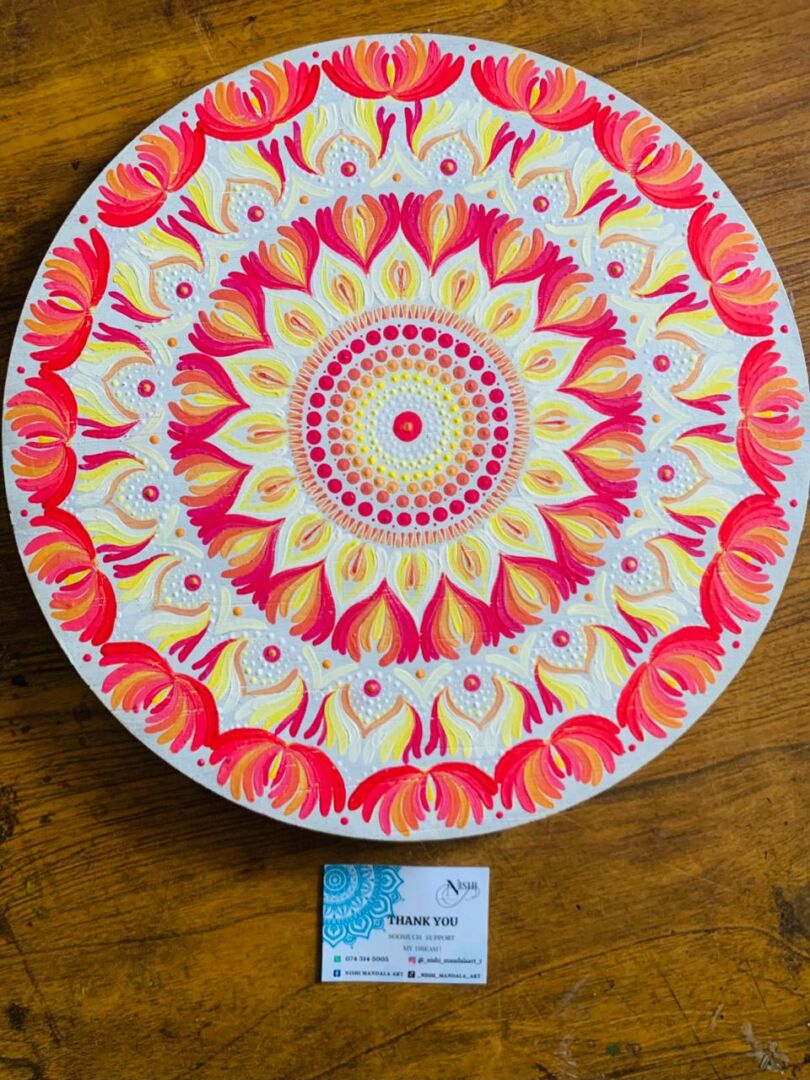 This Dot Mandala artwork is hand-crafted using high-quality acrylic and fabric paints on a durable MDF board surface. Each dot is placed with patience, balance, and intention, creating a harmonious rhythm that guides the mind into calmness and focus.