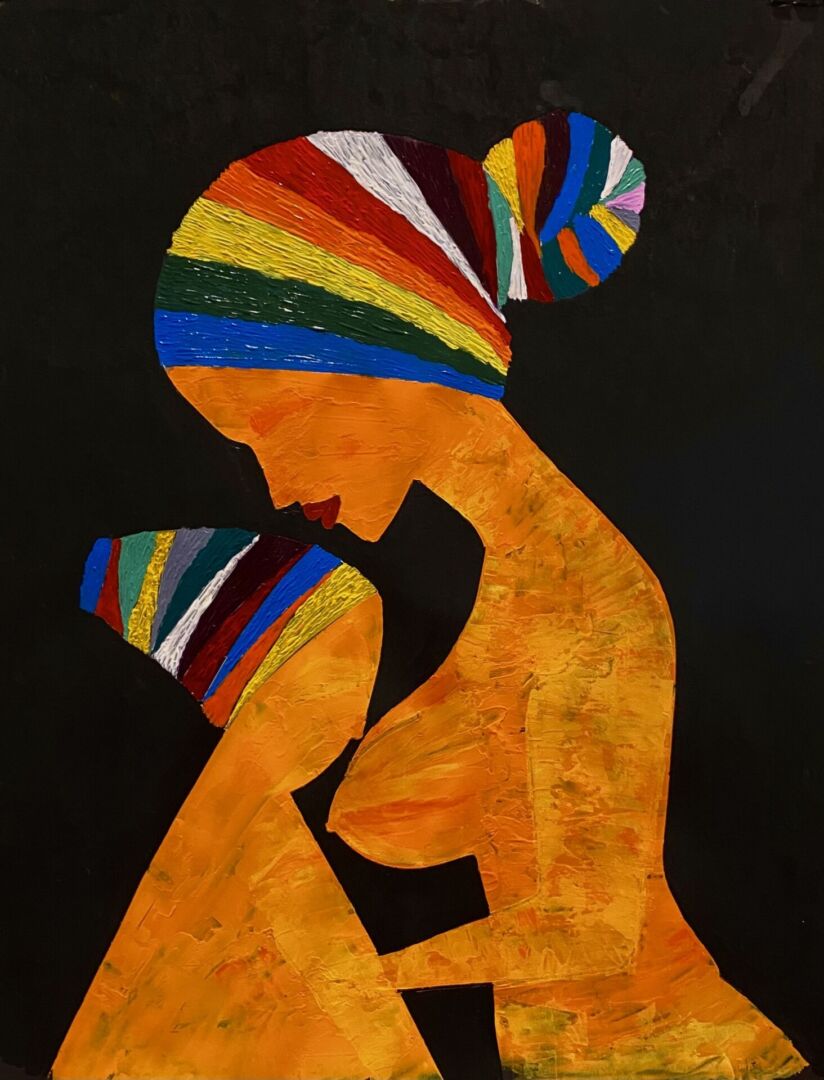 This artwork beautifully shows the deep and loving bond between a mother and her child. The painting uses simple shapes and warm colors to express strong emotions. The mother and child are shown facing each other closely, creating a feeling of care, safety, and connection. Their bodies are painted in rich orange tones, which suggest warmth, love, and protection. The gentle curve of the mother’s body around the child shows comfort and support, while the child’s posture reflects trust and closeness.