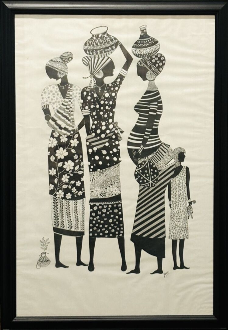 This artwork titled Hopes shows a beautiful and meaningful scene of women and a child standing together. The figures are painted in black and white using simple shapes and detailed patterns. Each woman is dressed in traditional clothing with different designs made of dots, lines, flowers, and geometric shapes. Some of them carry pots on their heads, which suggests daily life, responsibility, and strength. One woman gently supports a child, showing care, protection, and guidance.