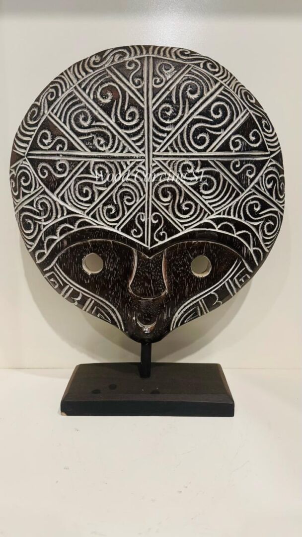 This exclusive wooden art piece is carefully hand-carved with detailed tribal patterns and fine craftsmanship. The round design and bold carving create a strong and elegant look.