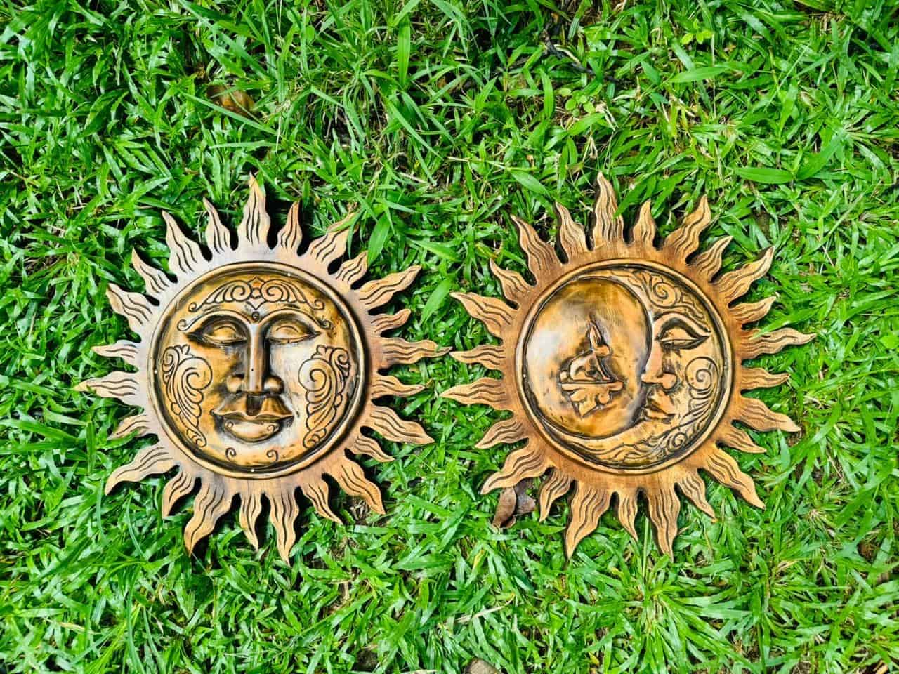 A handmade wooden sun and moon wall decor set. Beautifully carved with fine details and natural wood finish.