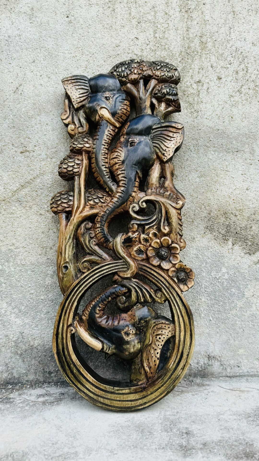 This handcrafted wooden sculpture shows elephants living peacefully in the forest, surrounded by trees and flowing nature. In many cultures, the elephant represents wisdom, protection, and good fortune. It is also a symbol of harmony between humans and nature.