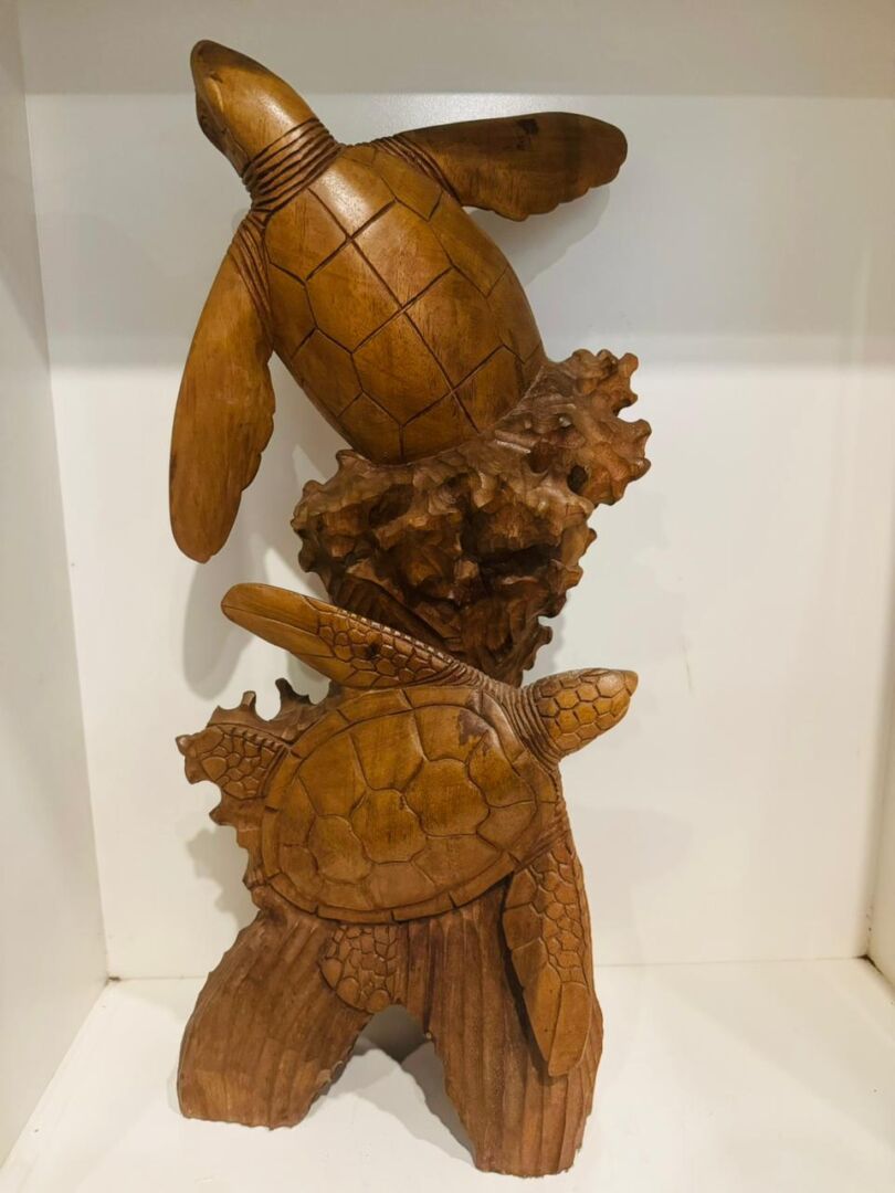 A handmade wooden sculpture of two sea turtles. Beautifully carved with natural wood finish and fine details.