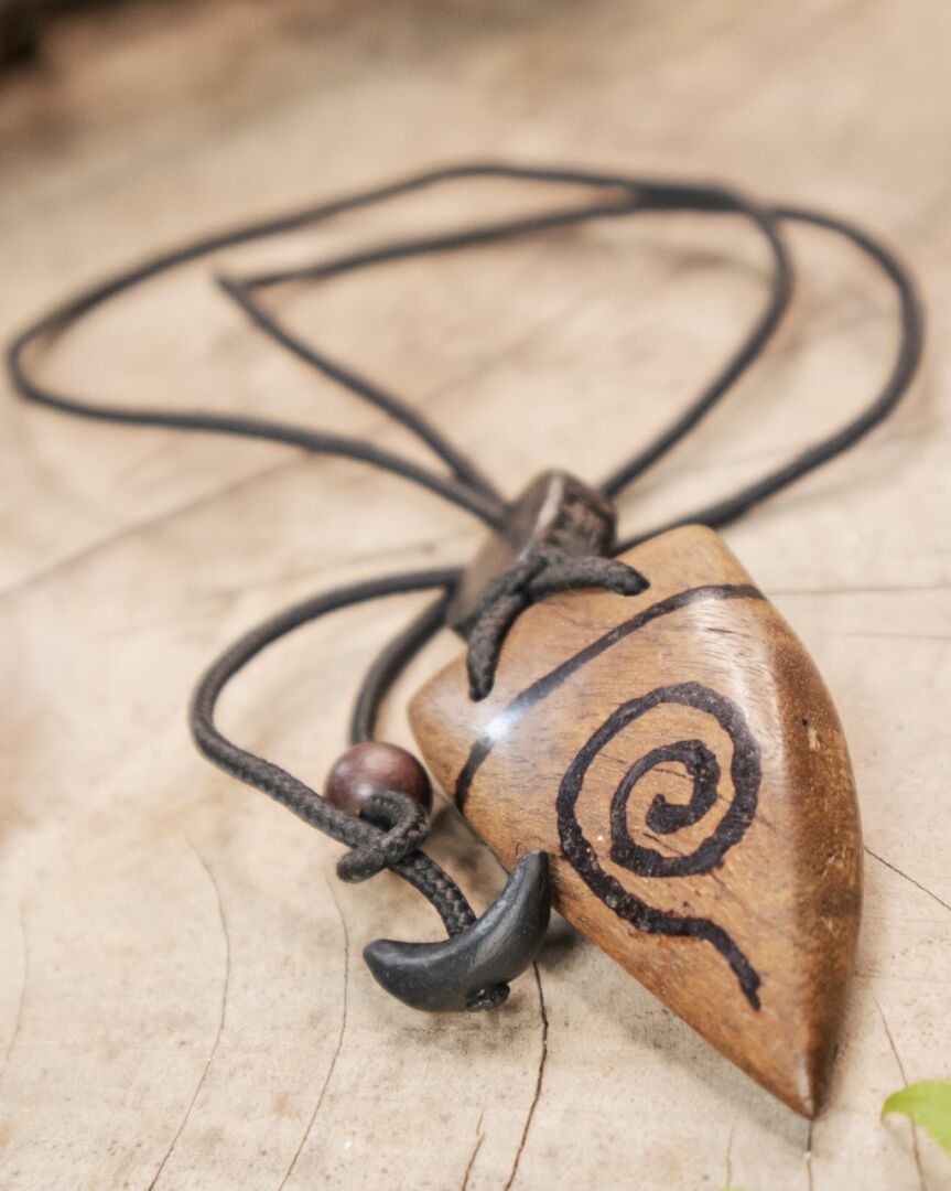 This handcrafted artwork is a unique wooden pendant necklace made with care and traditional handcraft techniques. The pendant is carved by hand from natural wood and shaped into a simple, elegant form. A hand-drawn spiral design is added to the surface, giving the piece a natural and artistic look. The natural wood grain and warm color make each pendant special and unique.