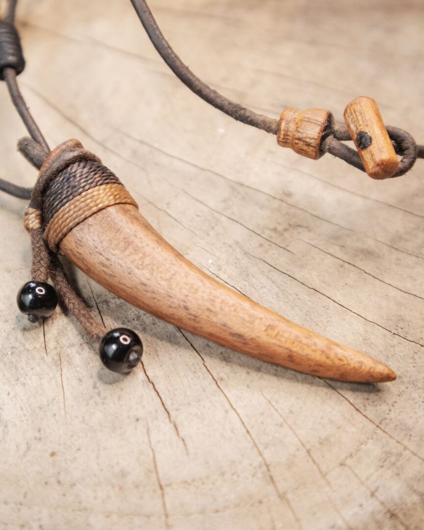 Hand crafted wooden tiger tooth, attached with strong leather cord. and hand made beads.